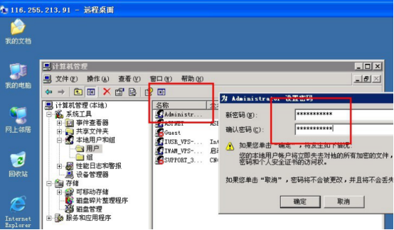 首次登陸請及時(shí)修改服務(wù)器密碼:右擊“我的電腦”—— 選擇 “管理”—— 選擇“本地用戶和組”——單擊“用戶” ,右側(cè)可以看到默認(rèn)的系統(tǒng)帳號“Administrator”——右健點(diǎn)擊“設(shè)置密碼” 來設(shè)置您自己的密碼。如圖
