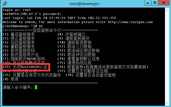 這個(gè)同學(xué)的寶塔面板沒有辦法登錄,但是SSH是可以登錄的,然后進(jìn)行命令操作,關(guān)閉23認(rèn)證。然后我再重啟服務(wù)器之后可以登錄寶塔面板,估計(jì)他開啟到BasicAuth認(rèn)證功能。