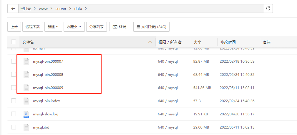 2.想要完成mysql的刪前恢復(fù),mysql必須開啟了二進(jìn)制日志,寶塔面板下這一功能是默認(rèn)開啟的,想要確定你的mysql是否開啟,最直接的辦法,就是去/www/server/data目錄下,看看有沒有幾個(gè)mysql-bin文件或者全盤搜索全盤搜索mysql-bin文件,像下圖這樣的: