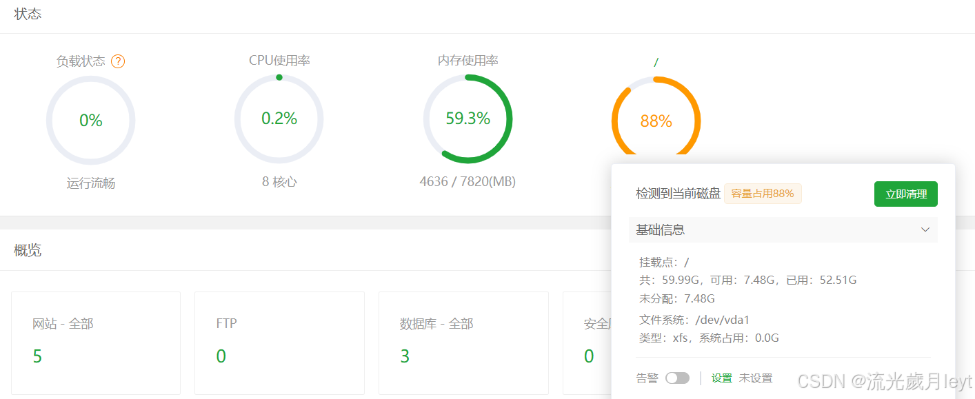 在寶塔面板首頁(yè),通常會(huì)有一個(gè)“磁盤(pán)使用情況”的概覽,這里可以直觀(guān)地看到各個(gè)分區(qū)的使用情況。如果發(fā)現(xiàn)某個(gè)分區(qū)接近滿(mǎn)容量,那么清理工作就尤為必要了。
